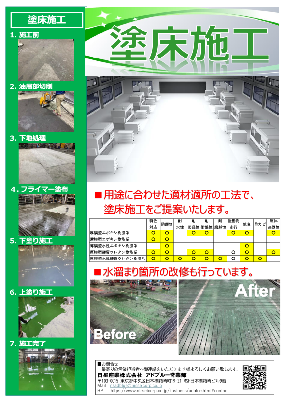 建物の用途・環境に合わせて塗り床改修をご提案いたします。フラットな床にすることでの荷崩れ防止、防滑仕様、ゾーニングなど現場環境の改善をいたします。地盤沈下、傾斜、たわみも同時に修繕可能です。