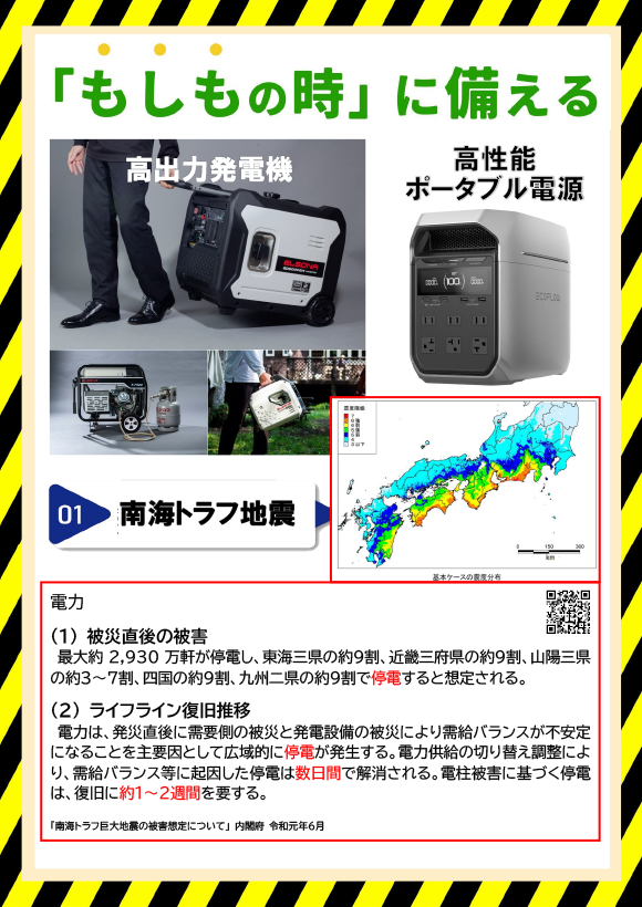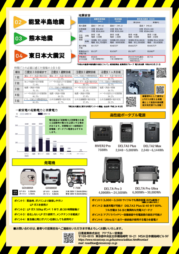 当社品はガソリンに加え復旧が早いLPガスでも発電できるため安全を確保しつつ早期に復旧して事業を再開できます。さらに蓄電池を活用することでライフライン復旧まで時間を要する場合でも事業を継続できます。