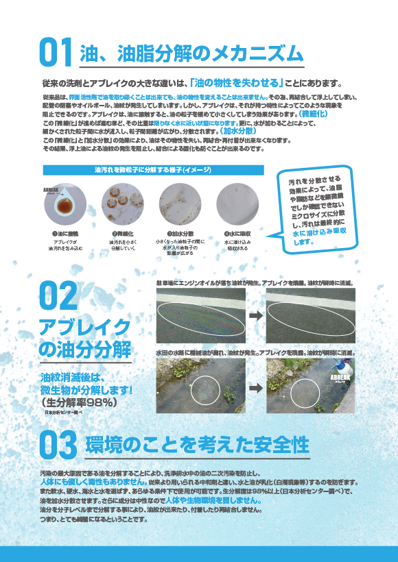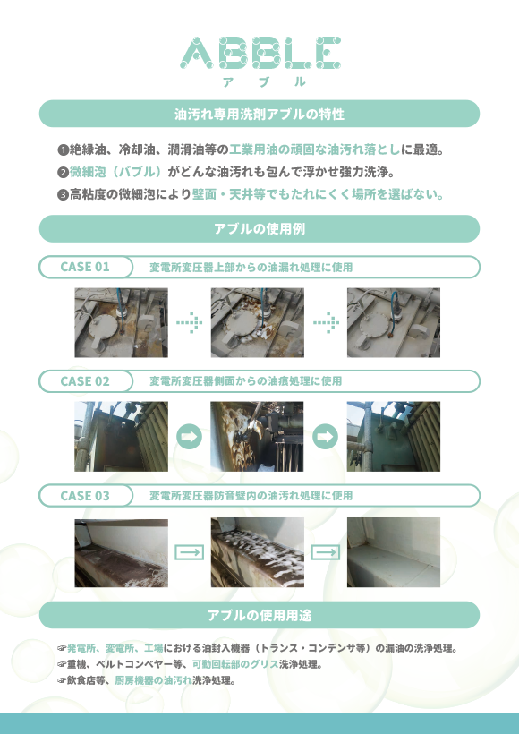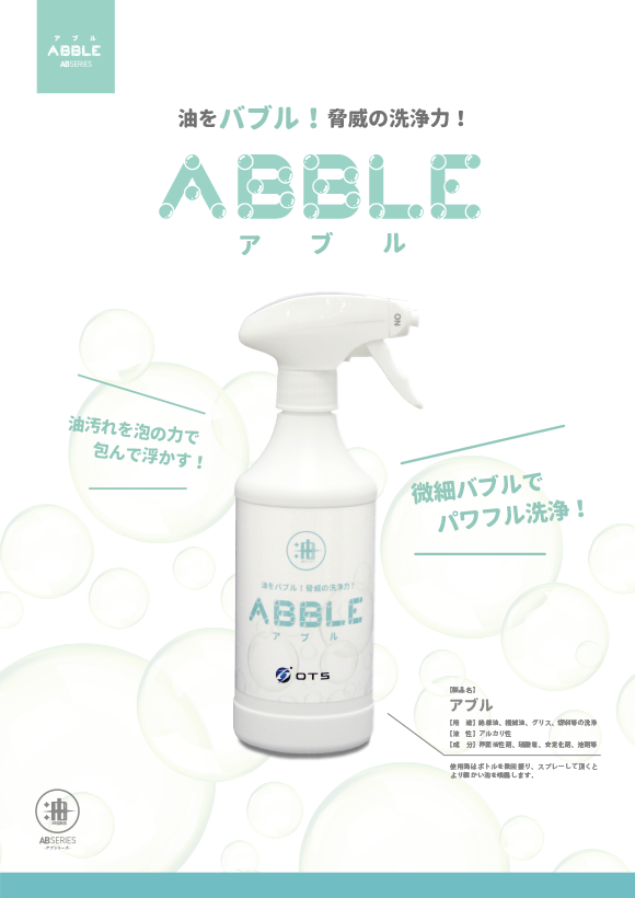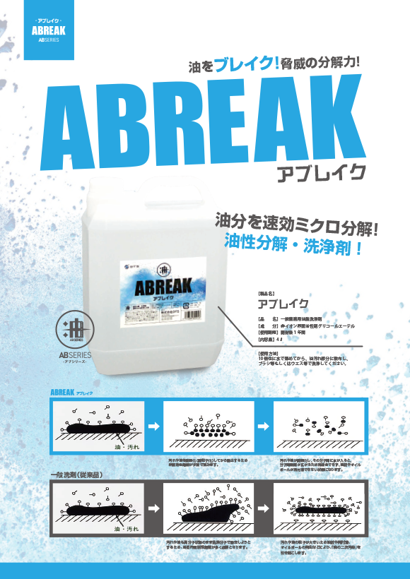 工業用油汚れ専用洗剤「アブル」、油脂洗浄剤「アブレイク」の2種類です。「アブル」は頑固な油汚れ落としに最適です。高粘度の微細泡がどんな汚れも包んで浮かせ強力洗浄します。「アブレイク」は油の物性を失わせる油性分解洗浄剤です。工事現場や整備工場などの油を使用する現場におすすめです。