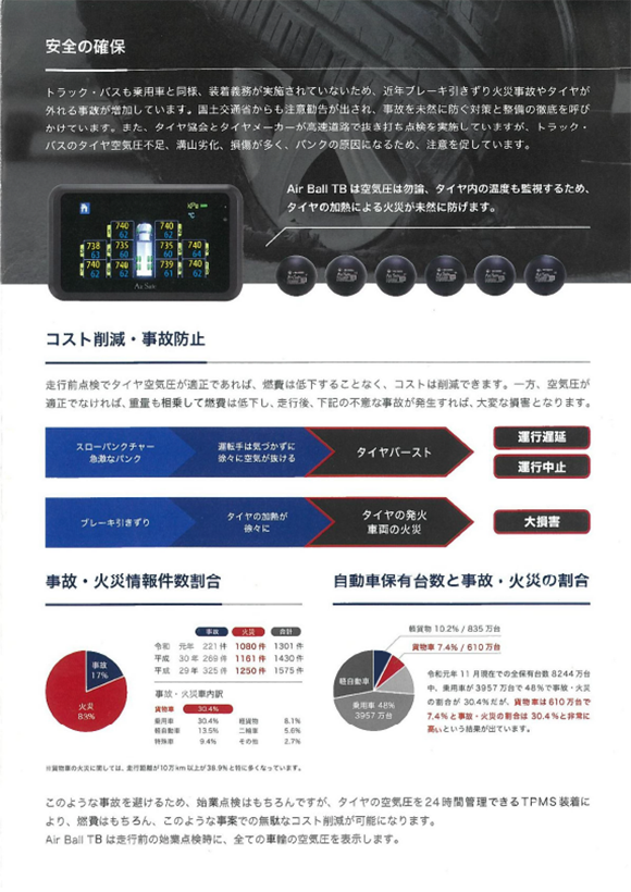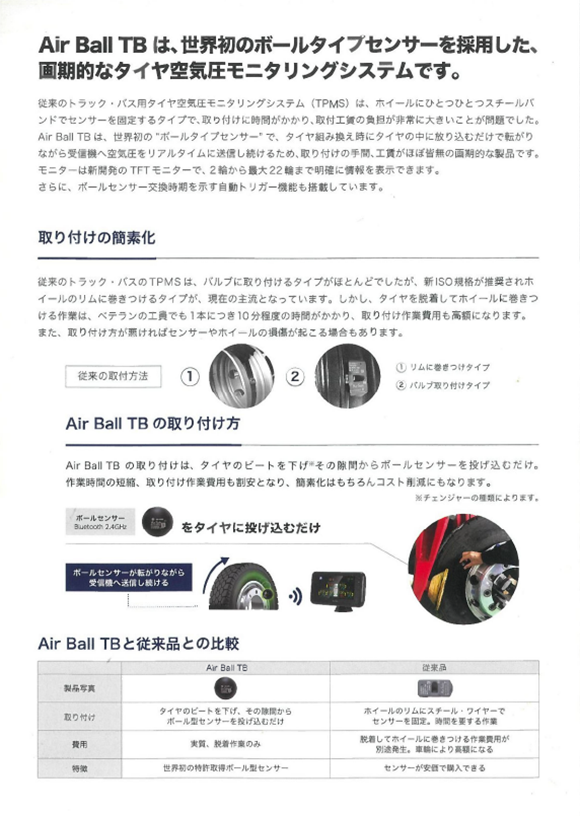 世界初のボール型センサーにより、タイヤの中に投げ込むだけで完了し億劫な取付作業・時間とおさらば! トラブル前兆を検知し運転手に即時通知で重大事故を防ぎます。