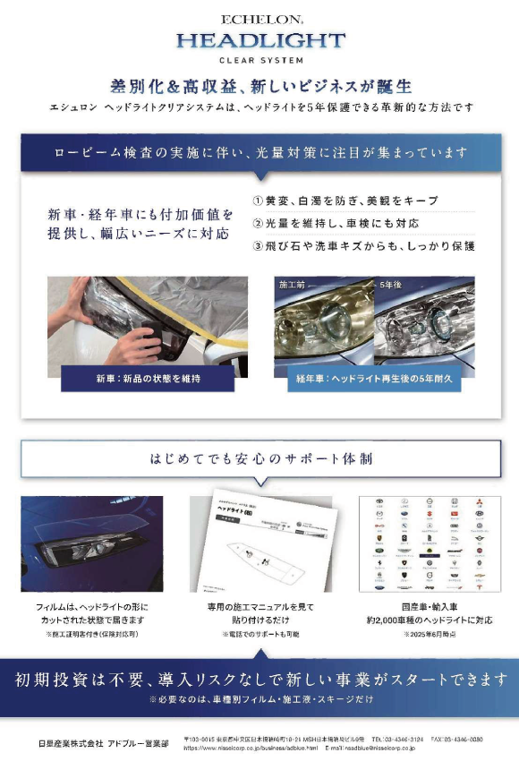 約5年間、ヘッドライトを保護し黄変、白濁を防止します。光量維持し車検対応! 飛び石からも保護します!!